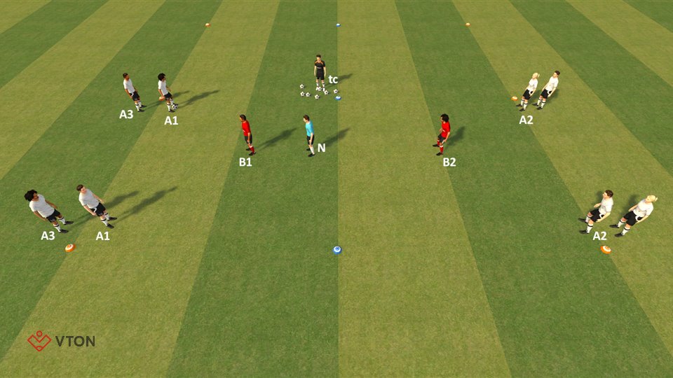 - Bal uit, dan speelt de trainer gelijk een nieuwe bal in naar het volgende tweetal.